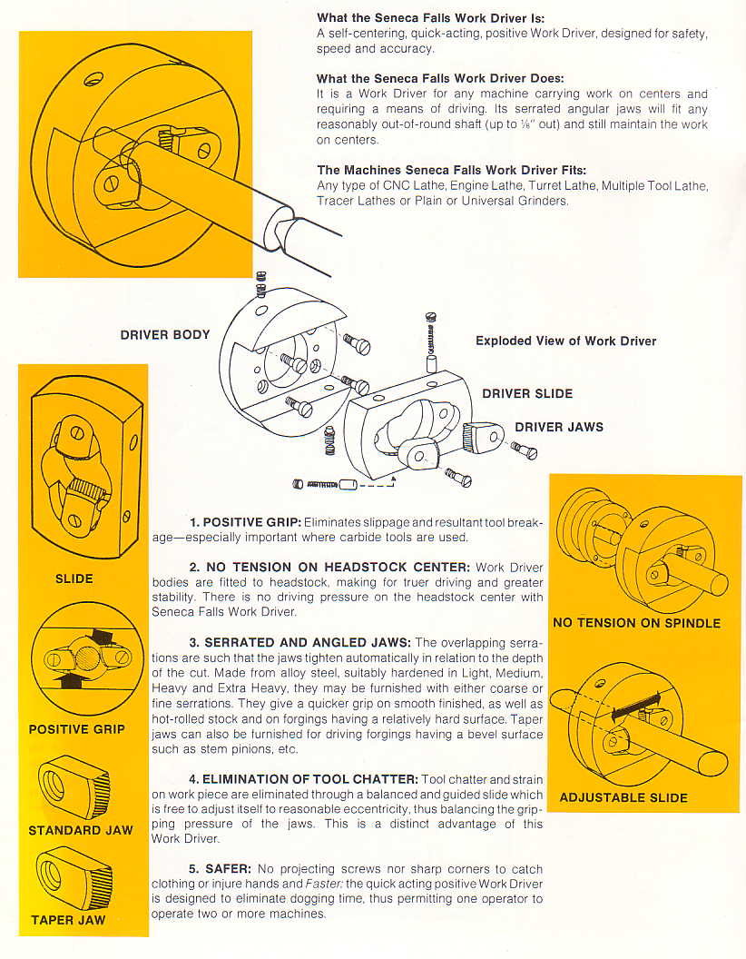 Compared with air or hydraulic chucks, the Seneca Falls Machines Automatic Work Driver offers simplicity and low cost when applied to between-centers work on forging, castings, straight or tapered pieces, and bar stock.